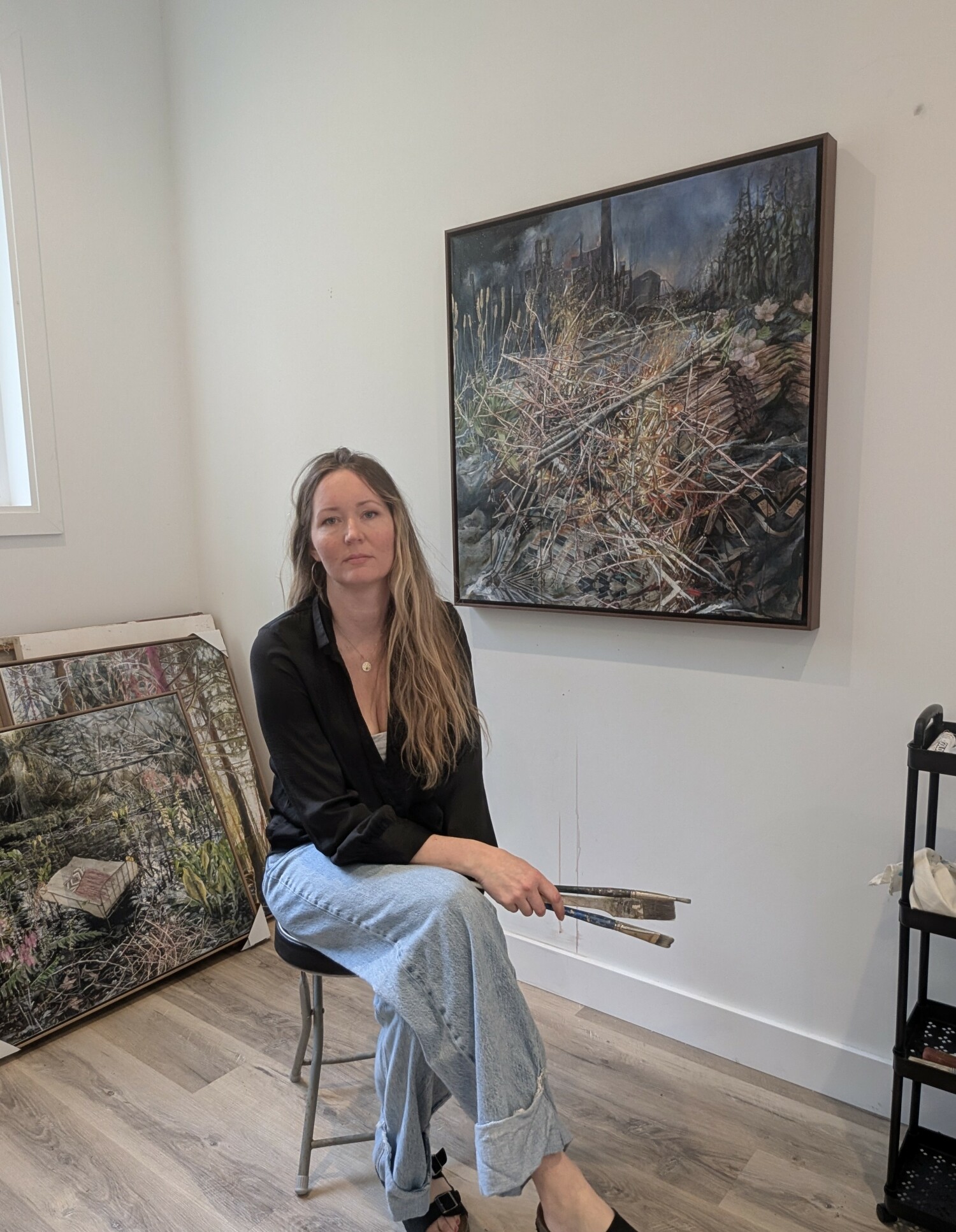 Miel Creasey has lived in and spent time across various coastal communities throughout British Columbia. She graduated with a Bachelor of Fine Arts from Emily Carr University in 2012, her work is held in private collections across Canada and the United States. Creasey has since returned home to qathet where she lives in the community of Tishosem with her husband and two children. Her work reflects her ongoing exploration of resilience, renewal, and the stirring beauty found between moments in time.